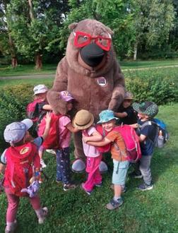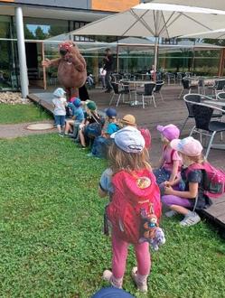 Danach liefen wir weiter durch den wunderschön, angelegten Garten, bis zur Terrasse, bei der uns etwas Geheimnisvolles erwarten sollte. Ganz gespannt saßen die Kinder auf der Terrasse und als der Biber „Woody“ herauskam, waren sie sprachlos. Als das große Tier vor den Kindern stand, gingen einige gleich auf Woody zu, andere hatten auch Respekt vor ihm. Woody war nicht nur kuschelweich, sondern hatte sogar Malbücher mit passenden Buntstiften für jedes Kind dabei.