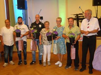 Vereinschef Andreas Böhme (re.) und Schatzmeister Mike Brückmann (li.) zeichneten auch die engagierten Übungsleiter/innen aus: (v.r.) Frank Friebe, Annita Rödiger, Elfriede Eifler, Christopher Bunk und Benjamin Mayer