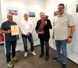 Ein feierlicher Moment: Bürgermeister Rainer Lämmerhirt erhält vom bisherigen Besitzer, Michael Zeihs, die Raspe-Figur für das Museum. Zeugen der Schenkung: Ronny Schanz und Peter Baum vom Burgverein.