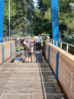 Die Arbeiten am Ebenshäuser Steg sind inzwischen gut vorangekommen. Die beidseitigen Geländer sind erneuert, am Bau der Außenhauten wird gearbeitet.