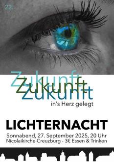 | 20.00 Uhr | Kirche Creuzburg, 22. Lichternacht „Zukunft ins Herz gelegt“ |