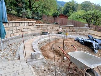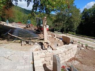 Unser Foto zeigt an ganz entscheidende Stelle des Friedhofes, an der gerade intensiv gearbeitet wird. Diese leicht ansteigende Wegeführung mit der abschließenden Mauer wird die Umrundung für eines der vorgesehenen Baumgräber des Friedhofes. Am rechten Bildrand wird dann der Baum gepflanzt und nach der Fertigstellung und Gestaltung der Fläche werden die Grablegungen der Urnen für diese neue Begräbnisart möglich sein.