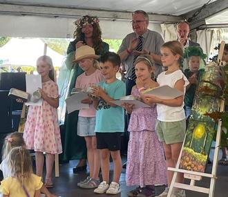Danach ging es auf der Bühne im Festzelt weiter. Die Waldelfen der Grundschulen Nazza und Creuzburg stimmten das Publikum mit Gedichten zum Wald ein. Als Waldfee moderierte Naturführerin Susanne Merten die Auszeichnung. Sie betonte, dass jedes Bild einen wertvollen Beitrag zum Erfolg des Wettbewerbs geleistet hat und bedankte sich herzlich bei allen Mitwirkenden.