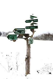 Unser Foto entstand auf dem Harsberg, am Wanderwegweiser, der den Hainichlandweg und die Wege nach Mihla und in andere Richtungen ausweist.