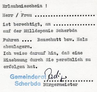 Bis 1991 war mit solchen Erlaubnisscheinen die Nutzung der gemeindeeigenen Mülldeponie gestattet