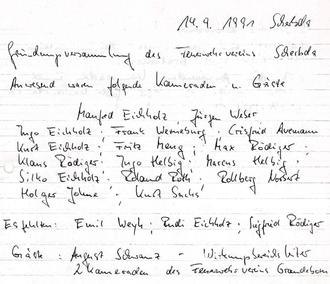 Auszug aus dem Gründungsprotokoll des Feuerwehrvereins Scherbda vom 14. September 1991