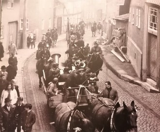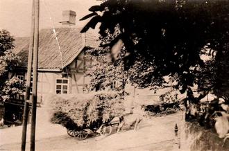 Ein historischer Blick auf die alte Gemeindebackstube am Anger in Mihla. Die von den Harstalls verpachtete Bäckerei ist bis in das frühe 18. Jahrhundert nachweisbar. Das Foto wurde vom Pfarrberg her aufgenommen. Vor der Backstube begegnen sich gerade zwei Kuhgespanne.