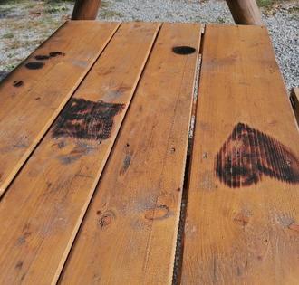 Nun musste festgestellt werden, dass Ende September Unbekannte die Bänke und den Tisch erneut mit Feuer verunziert haben. Unfassbar, nicht einmal ein halbes Jahr war der Raufe gegönnt, ohne hässlichen Brandflecken die Gäste zu begrüßen.