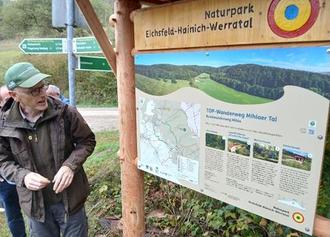 Uwe Müller vom Naturpark, Hauptakteuer bei der Einrichtung des Weges, erläutert eine neue Infotafel. Zwei dieser Art sind errichtet worden, hinzu kommt die Panoramatafel am Fliegerhang des Harsberges. Im Hintergrund die neuen Wegweiser des TOP-Wanderweges.