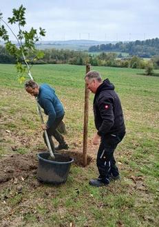 Gärtnermeister Michael Möbius beim Pflanzen der Roteiche, links mit Marcel Rost in Ebenshausen und rechts mit Ronald Weber in Frankenroda