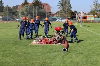 Noch während der Wettkämpfe durften einige Kinder unserer Jugendfeuerwehr ihr Wissen unter Beweis stellen und die Jugendflamme unter der Leitung von Christin Heim und Daniel Hörschelmann ablegen. Auch durften wir von den beiden einer Vorführung der Gruppenstafette folgen.