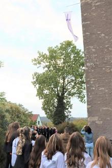 Roland Wagner hatte im Turm, wie schon in den letzten Jahren bereits alles vorbereitet. Nach dem Empfang der Kirmesschar durch Pfarrer Hoffmann und dem Spielen eines Chorals entfaltete sich dann die Fahne und weht nun die nächsten Tage über Mihla.