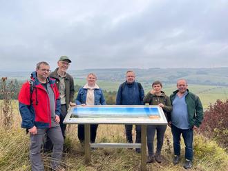 Blick auf die neue Panorama-Tafel am Fliegerhang Harsberg - v.l.n.r. Toni Nickol, Ortsteilbürgermeister Mihla, Uwe Müller, Mitarbeiter Naturparkverwaltung, Franziska Wehr, Hessensound Group GmbH, Rainer Lämmerhirt Bürgermeister Stadt Amt Creuzburg, Claudia Wilhelm, Leiterin Naturparkverwaltung und Ronny Schwanz, Ortsteilbürgermeister Creuzburg