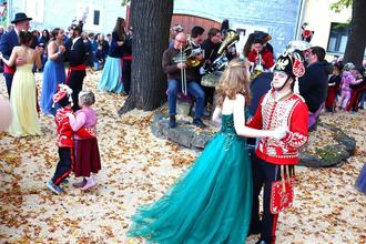 Gemeinsam geht es vom Kirmeslokal durch den Ort zum Anger. Ein wunderbarer Anblick, ältere und jüngste Pärchen schön miteinander verbunden!