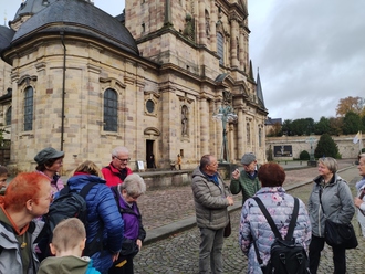 Das Unternehmen Gabriel-Reisen aus Wutha-Farnroda machte unser Vorhaben möglich, auf das sich unsere Vereinsmitglieder schon lange gefreut haben. Als wir am vereinbarten Treffpunkt, dem Domplatz in Fulda, ankamen, wurden wir auch schon von den beiden Reiseleitern empfangen. Schnell waren wir in zwei etwa gleich große Gruppen aufgeteilt und die erste Führung durch den Dom konnte beginnen. Von unseren Reiseleitern konnten wir viel Neues erfahren, so dass der Dom zuerst als Abteikirche des Klosters Fulda in der Zeit von 1704 bis 1712 als dreischiffige Basilika gebaut wurde und ab 1752 als Kathedrale des Bistums Fulda diente. Der Dom ist gleichzeitig Grabeskirche des heiligen Bonifatius, der auch auf dem Burgberg von Creuzburg im Jahre 724 ein Kreuz errichtet haben soll. Natürlich haben wir das Grabmal des Bonifatius, das sich hinter dem Altar befindet, besichtigt. Er ist auch in der Stadt als Denkmal zu sehen und als Namensgeber des davor liegenden Platzes allgegenwärtig.
