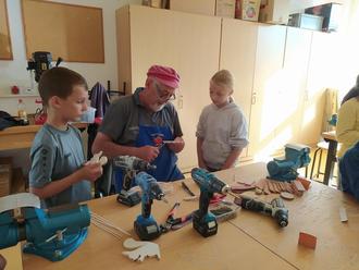 Der Freitag stand ganz im Zeichen von Holzarbeiten - Herr Oelszner aus Bischofroda kam zu uns. Wir hatten viel Spaß z.B. beim Bohren, Schleifen, Bemalen von Holzfiguren (z.B. Eichhörnchen, Schmetterlinge, Herzen, Pilze)