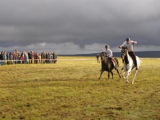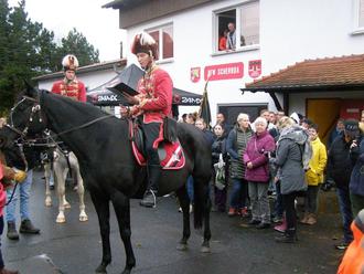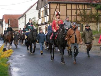 Dabei hatte Elias mit dem Iftaer Erfolgspferd 'Koran' im Ziel der 300 m langen Strecke gerade mal eine halbe Pferdelänge Vorsprung auf Benjamin, der das Falkener Pferd 'Penny' von Halter Mike Cron unter dem Sattel hatte. Viele Scherbdaer und Gäste aus den umliegenden Kirmesorten hatten das Rennen oberhalb des Ortes verfolgt und zogen dann mit dem Tross auch wieder in den Ort zu den Kirmesreden der Husaren ein.