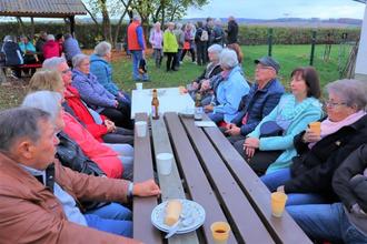 Begrüßung der Wanderer in Ebenshausen durch Dr. Hartung und Frau Schneider. Dann geht es zur Ebenshäuser Kirche.