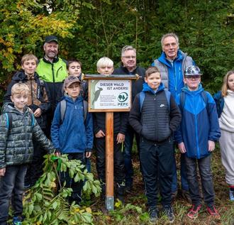 Eine Aktivität aus dem letzten Jahr: Neue Hinweisschilder für den PEFC-Wald werden gemeinsam mit den Schülerinnen und Schülern, Forstamtsleiter Dirk Fritzlar, Bürgermeister Rainer Lämmerhirt und Peter Gaffert, dem Vorsitzenden von PEFC-Deutschland, am Harsberg aufgestellt.