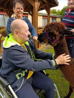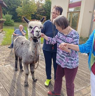 Die südamerikanischen Kamele konnten an der Leine über das Außengelände geführt werden. Immobile Bewohnerinnen und Bewohner konnten die Tiere in ihren Zimmern betrachten und streicheln.