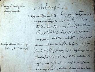 | - | Die Markierung + verweist darauf, dass hier noch etwas einzufügen ist. Die Titulatur ist schon angedeutet: FW H zu Sachßen (Friedrich Wilhelm Herzog zu Sachßen). Vielleicht Von Gottes Gnaden? Eine andere, aber keine zu große Bedeutung des + kann nicht ausgemacht werden. |