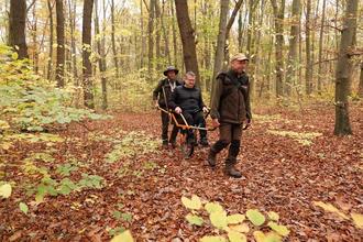 Auf dem Wanderrollstuhl Joelette lässt sich auch im Herbst auf feuchten und rutschigeren Wegen der Wald vortrefflich erleben. Das bestätigen der Inklusionsbotschafter Marco Pompe (Mitte) sowie die Ranger Christian Schöpke (links) und Christian Volk.