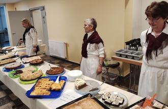 Drei lange Kaffeetafeln in der Mitte des Saals boten viel Platz für eine gemütliche Runde. Für Kaffee und den reichhaltigen Kuchen sorgten zahlreiche fleißige Helferinnen und Helfer.