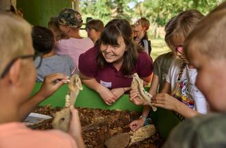 Die Commerzbank-Umweltpraktikantin entdeckt mit Kindern die Schätze im Wühlkasten des UrwaldMobils.