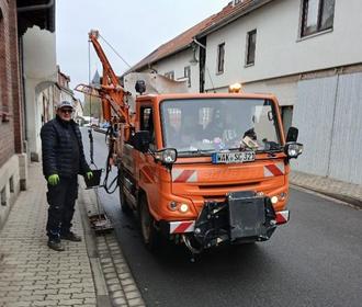 Mit der Technik des Bauhofes Creuzburg werden hier gerade Einläufe in der Mihlaer Ortslage gesäubert. Die Bauhöfe arbeiten hierbei eng zusammen.