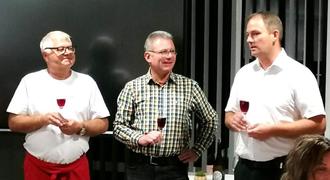 Uwe Sülzner (links, Feuerwehrverein), Winzer Peter Brunk und Ortsbrandmeister Markus Mayer begrüßen die Gäste und erklären den Ablauf der Weinprobe.