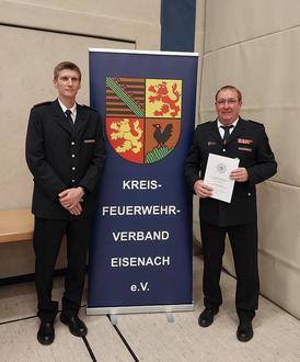 Für die geleistete Arbeit der vergangenen Jahre wurde er vom Verbandsvorsitzenden Sebastian Fischer mit dem großen Ehrenzeichen des Kreisfeuerwehrverbandes Eisenach ausgezeichnet.
