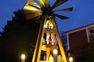 Mit dem ersten gemeinsamen Anschieben der neuen Weihnachtspyramide im Dorfzentrum beginnt am