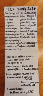 In der traditionell vom Schmeckchen Jannes Herold vergrabenen Flasche endete die Kirmes 2024 an der Heimatscheune. Trotz einiger Reformen, einiges an Gegenwind (gerade von ehemaligen Kirmesburschen) und einiger nicht vorhersehbaren Umstände hat es die kleine Gruppe von 11 Kirmesburschen, zusammen mit den Kirmesmädchen, „gerockt“. Das sollte nicht unerwähnt bleiben.