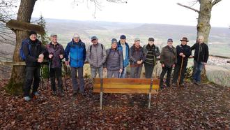 nicht des Literarischen (s. unten), sondern des Hölzernen auf dem Heldrastein, Klaus Reinz, begrüßen. Dieser wollte sich auch an unserer Wanderung beteiligen. Auf dem Heldrastein wartete noch ein Schnupperwanderer aus Treffurt auf uns.