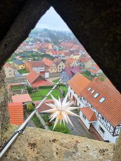 Pünktlich vor dem 1. Advent war der Herrnhuter-Stern in gemeinsamer Arbeit von Roland und Marko Wagner und Pfarrer Hoffmann am Westfenster des Kirchturms befestigt worden. Nun stimmt der leuchtende Adventsstern die Menschen auf die Weihnachtszeit ein. Nach zwei Jahren der Pandemie bisher ohne die Einschränkungen der letzten Jahre. Schon am 1. Advent wird es auf dem Marktplatz vor der Kirche wieder einen Weihnachtsmarkt geben.