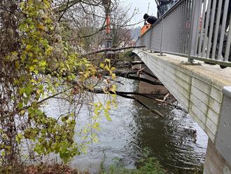 Die Masse der Holzstämme und die dadurch bereits entstandene kleine Insel behinderten den Durchfluss unter der Brücke bereits enorm und stellten für die im Winter möglichen Hochwassersituationen eine hohe Gefährdung dar.