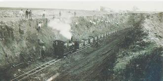 Sogar eine dampfbetriebene Feldbahn mit vielen Loren kommt zum Einsatz. Viele Hilfskräfte, wie wir wissen damals vor allem aus Italien und Kroatien angeworben, schaufeln mit der Hand, um den Einschnitt zu vertiefen und die Seiten so abzuschrägen, dass ein späterer Hangrutsch unmöglich wird.