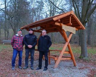 Indienststellung der neuen Sitzgruppe: Carsten Tobisch, Vorsitzender der Jagdgenossenschaft Ebenshausen, Matthias Genzel, Stadtrat aus dem Ortsteil, und Bürgermeister Rainer Lämmerhirt-