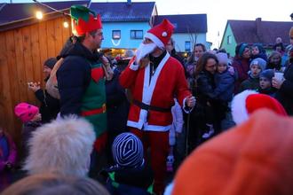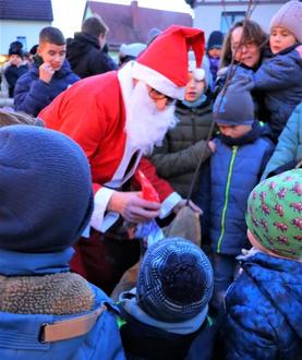 Der Weihnachtsmann und sein Gehilfe standen auf dem Mihlaer Weihnachtsmarkt sofort im Mittelpunkt. Die Kinder umringten die beiden, so dass sie gar nicht bis zum Weihnachtsbaum, den traditionellen Übergabeort der Geschenke, vorstoßen konnten.