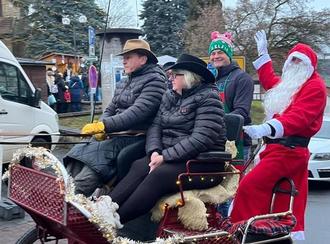 Ein Weihnachtsmann muss natürlich standesgemäß mit Kutsche unterwegs sein und wenn schon kein Schnee, dann eben die Kutsche. Auf jeden Fall braucht er einen starken Gehilfen…