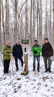 Die erste Etappe führte über „Das Hannerode“ und „Die Ziegenleite“ entlang der einstigen Weimarischen Landesgrenze zum Dreiherrnstein. Auf der dreiseitigen Grenzsäule stehen die eingemeißelten Großbuchstaben HSG, SWE und KP für die einstigen Herrschaftsgebiete Herzogtum Sachsen-Gotha, Großherzogtum Sachsen-Weimar-Eisenach und Königreich Preußen. Hier treffen damals wie heute die Herrschafts-/ Gemarkungsgrenzen Nazza (HSG), Mihla (SWE) und Kammerforst (KP) an einer Stelle zusammen. Das Amtsgericht Nazza war eine der Exklaven des Gothaer Herzogtums, mit den Bezeichnungen HSG, zum Teil auch HG, oder nur G auf den Steinen. Am Dreiherrnstein angekommen entstand das Foto der Wandergruppe (von links: Hartmut Wiegand, Jürgen Rokosch, Burkhard Fischer (Langula) und Andreas Wiegand. Wie bei der letzten Begehung sorgten auf dem Weg dorthin plötzlich zwei Wildschweine für einen kurzen Schreckmoment