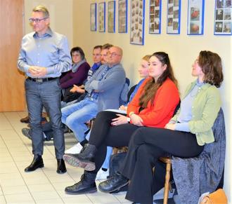 Herr Rottenbach von der Schnitzschule Empfertshausen stellt diese den Stadträten und den Zuhörern vor. Rechts die drei Sieger der Plätze 1 bis 3.
