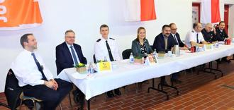 Neben Bürgermeister Rainer Lämmerhirt als Dienstvorgesetzten der Wehr hatten erstmals der im September letzten Jahres neu gewählte Landrat Dr. Michael Brodführer, die ebenfalls neu im Amt arbeitende Vorsitzende der VG Hainich-Werratal, Christin Bärenklau, Kreisbrand-inspektor Christian Grebe, Kreisbrandmeister Christian Mende, Stadtbrandmeister Thomas Andres, Uwe Sülzner als Vereinsvorsitzender des Mihlaer Feuerwehrvereins und, als Über-raschungsgast, Tobias Daum von Mihlas Partnerwehr Oberotterbach an der Südlichen Wein-straße in Rheinland- Pfalz, Platz genommen. Die Freunde aus Oberotterbach waren mit einer mehrköpfigen Delegation um Peter Brunk angereist, brachten ein Weingeschenk und viele Grüße mit.