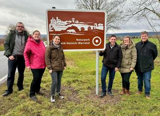 Knapp 30 touristische Hinweisschilder führen als "Willkommenstafel" in den Naturpark. Im Bild zu sehen die Projektbeteiligten: Michael Baller, Sylvia Grasreiner, Claudia Wilhelm und die Akteuere vor Ort Andreas Henning, Anne-Katrin Ibarra Wong und Christian Hecht
