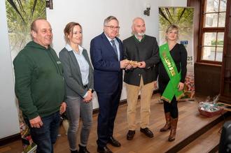 Der Moment der Staffelstabübergabe: Der Leiter des Stadtforstes Templin Herr Christian Hierdeis in Begleitung der Templiner Waldfee Lisa Benzmann übergibt den Staffelstab der Waldhauptstadt an Bürgermeister Rainer Lämmerhirt und an Christin Bärenklau, Chefin der VG sowie an Ortsteilbürgermeister Ronny Schwanz. Nun ist die Stadt Amt Creuzburg für ein Jahr deutsche Waldhauptstadt
