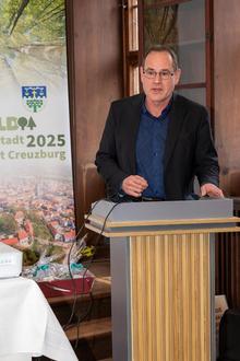 Dirk Teegelbekkers, Geschäftsführer von PEFC Deutschland e.V. erläutert die Gründe der Ernennung Amt Creuzburgs zur PEFC-Waldhauptstadt 2025: "Die Stadt Amt Creuzburg setzt sich in vorbildlicher Weise für eine nachhaltige Waldbewirtschaftung ein - ökologisch, ökonomisch und sozial. Das zeigen der PEFC-zertifizierte Kommunalwald und die dortige nachhaltige Weiterverarbeitung der Ressource Holz eindrücklich. Dieses Engagement hat die Jury des Deutschen Forst-Zertifizierungsrates überzeugt. Mit der heute verliehenen Urkunde wird dieser Einsatz gewürdigt und überregional sichtbar gemacht."