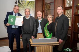 Der Geschäftsführer von PEFC Deutschland, Dirk Teegelbekkers, begleitet von der Delegation der Stadt Templin, überreicht die Urkunde