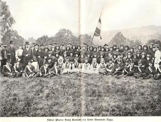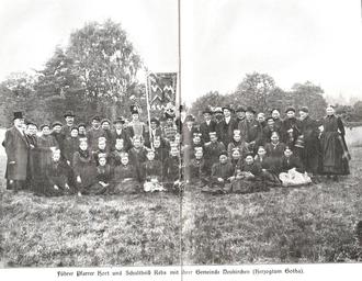 Die Teilnehmer am Trachtenfest aus Neukirchen unter Führung des Pfarrers Hort und des Schulheißen Rebs. In der Mitte auch in Neukirchen zwei Husaren in unterschiedlich alten Uniformen und die Kirmesfahne.