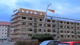 So wurde das Dach abgerissen, dort entsteht gerade ein neues Schrägdach, geeignet für eine Photovoltaikanlage. Dachwohnungen werden hier angeboten.