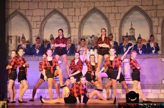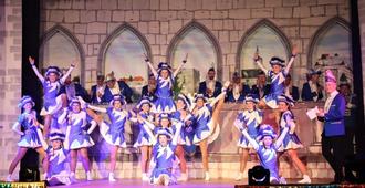 Der Tanz der Funkengarde zu Beginn der Festsitzung. Im Hintergrund der Elferrat mit dem gekonnten Bühnenbild.